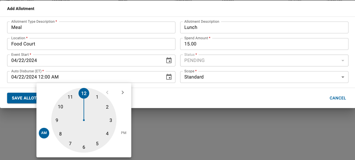 2. Fill in the allotment information. After selecting the Auto Disburse date from the calendar icon, you will be presented with a clock which allows you to choose the time of day for the disbursement.