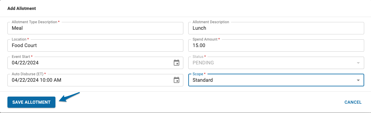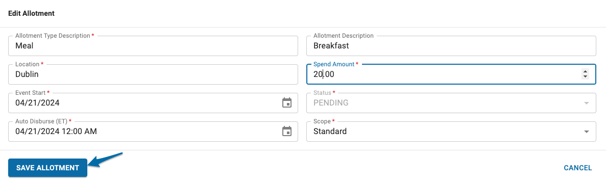 - Allotments may be edited any time prior to the auto disburse time ONLY.
