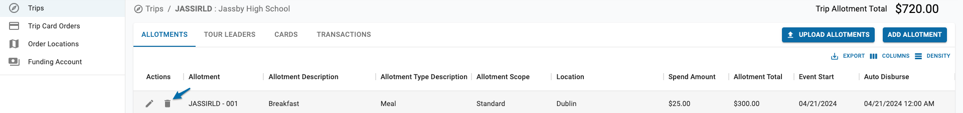 1. On the Trips tab, select the trip for which you are deleting an allotment > Under Actions, click the delete icon for the allotment being deleted.