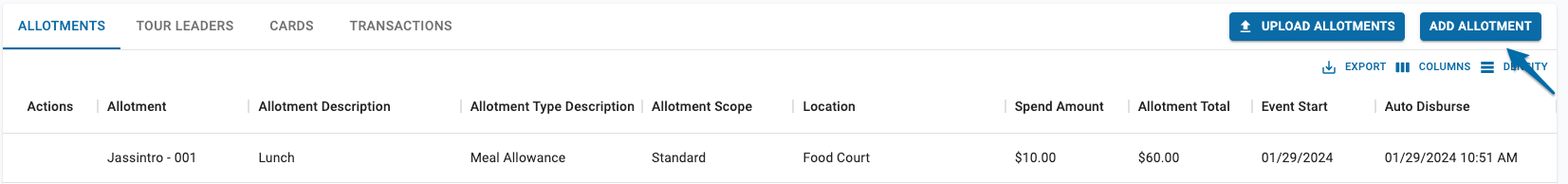 1. On the Trips tab, select the trip to which you are adding an allotment > Click ADD ALLOTMENT
