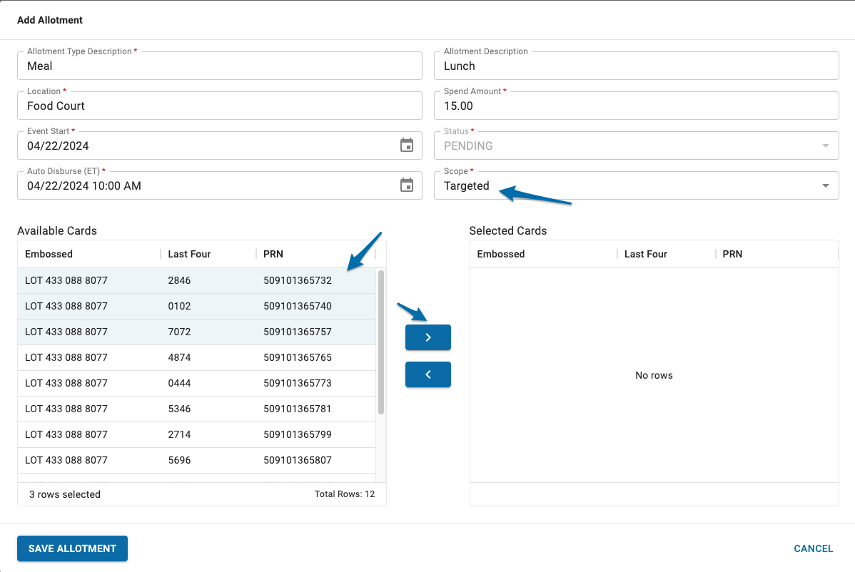 To create a targeted allotment, change the Scope to Targeted > Select the cards from the the list of Available Cards > Click the right arrow to move them to the list of Selected Cards.