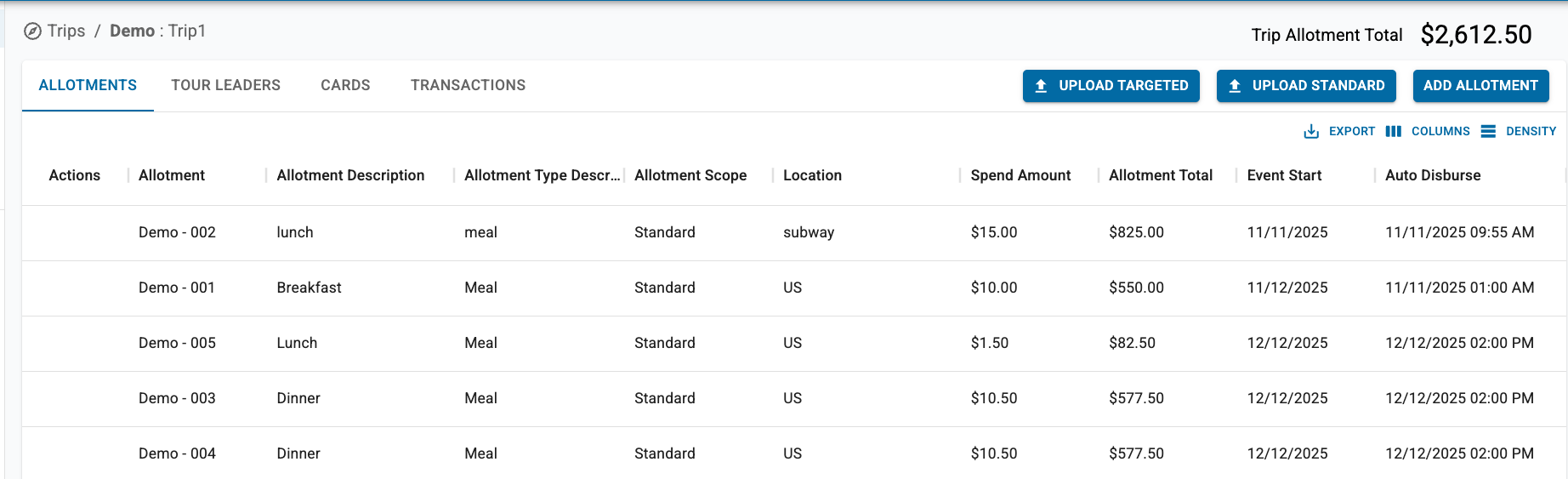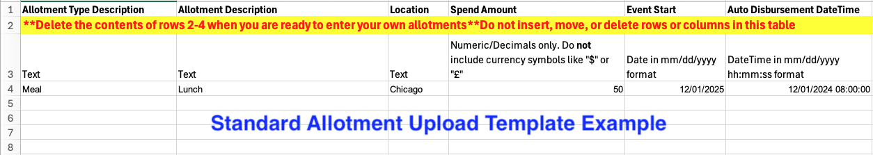 Bulk uploading allotments is available for standard allotments (allotments that are being disbursed to all Trip Cards associated with a trip) as well as targeted allotments (varied allotments that are being disbursed to specific trip cards). See the instructions for each below: