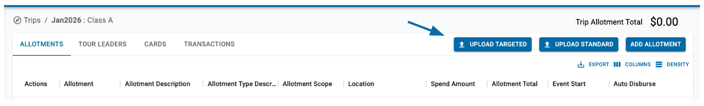 1. On the Trips tab, select the trip to which you are adding allotments > Click UPLOAD TARGETED