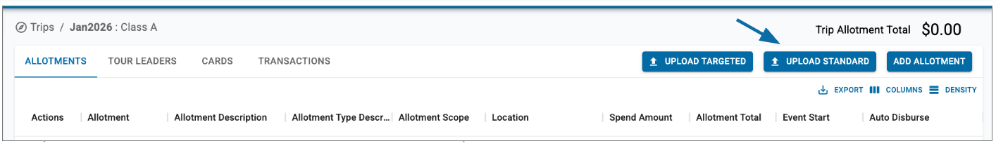 1. On the Trips tab, select the trip to which you are adding allotments and > Click UPLOAD STANDARD