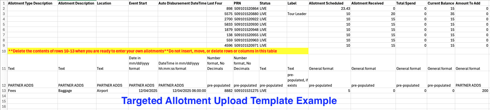4. Populate the template by adding Type, Description, Location, Event Start, Auto Disbursement DateTime and Amount to Add (Last Four, PRN, Status, Label, Altmnt Sched., Altmnt Rec'd, Total Spend, Current Balance will already be populated for you ).